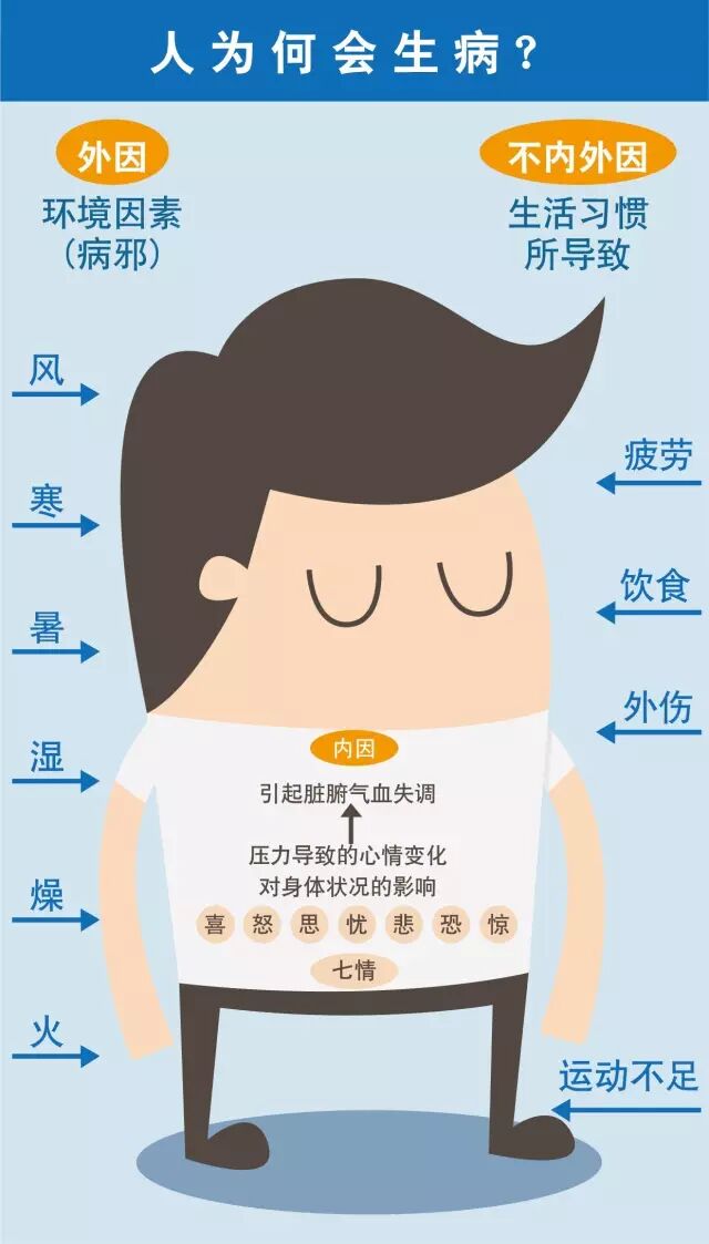 【內因】指人本身的體質。不僅包括與生俱來的先天體質,也包括因心情變動等因素所造成的后天體質。中醫特別重視精神狀態對身體造成的影響,將情緒變化分為【喜、怒、憂、思、悲、恐、驚】七種情緒(七情),并認為悲傷等情緒過度,會傷害內臟,超出人體調節能力,導致疾病。
