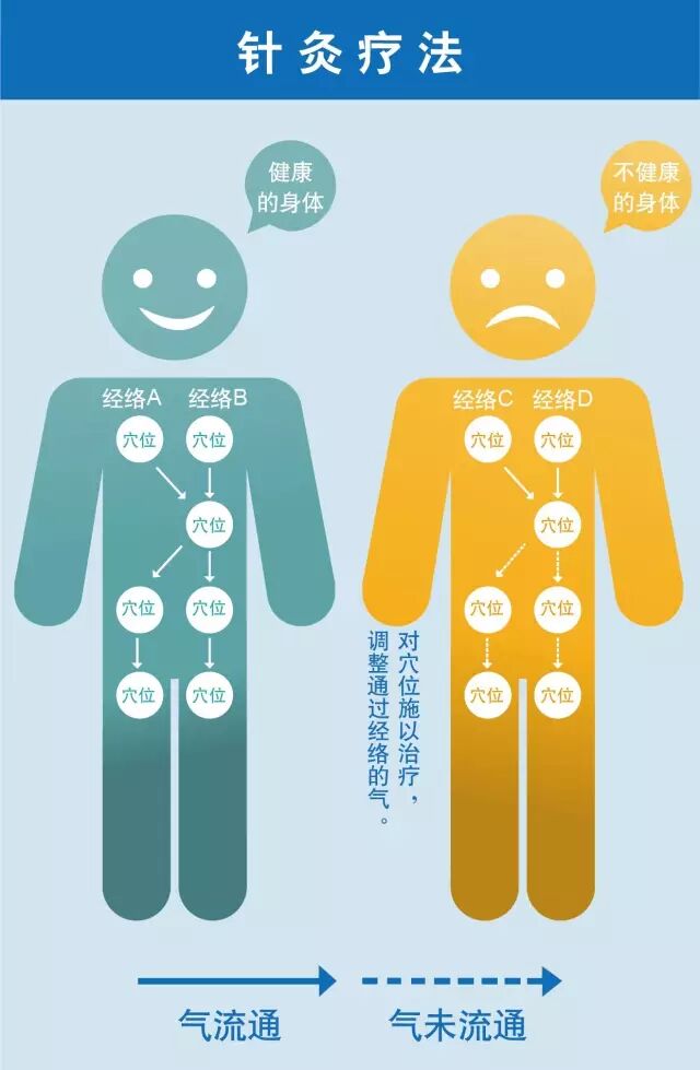 此時以針或灸就在經絡的反應點:穴位進行刺激,以調整氣的流動,便稱為針灸治療。針灸治療的一大特點,便是可以引導氣順暢流通,排除造成疾病原因的病邪。